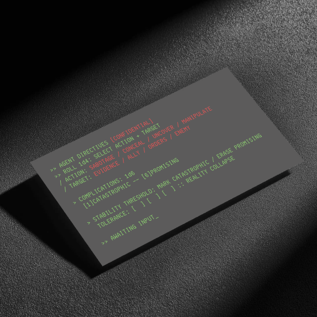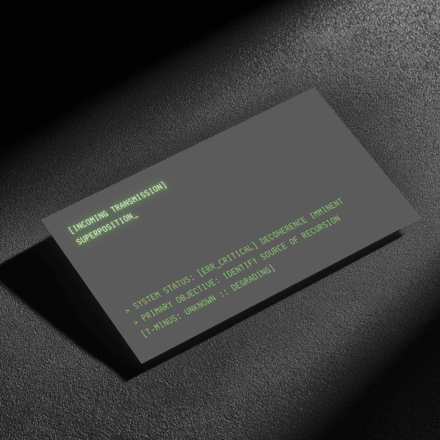 SUPERPOSITION_ is a micro-RPG for two or more players. Determine your secret agenda. Identify the source of the recursion. Eliminate it—or don't—before reality total destabilization. Each catastrophic outcome brings you closer to collapse.